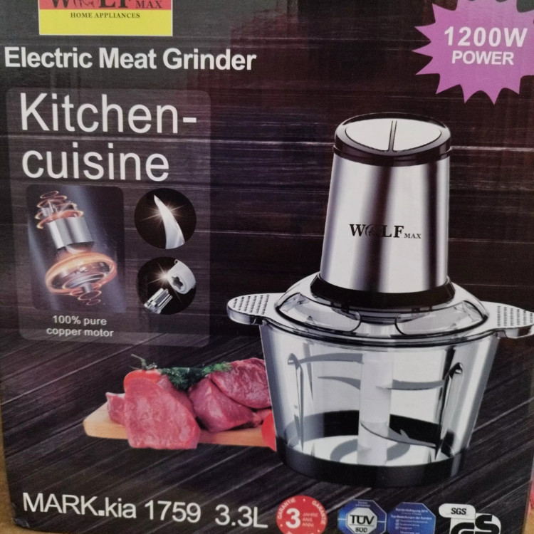 خرد کن wolf مدل دارای6 تیغ استیل ضد زنگ قابل شستشو توان الکتریکی 1200 وات دو سرعته موتور 100درصد مس خالص ظرف شیشه ای نشکن 3.3 لیتری قابلیت خرد کردن گوشت و مرغ بصورت یکنواخت